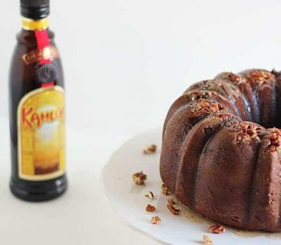 Using a mixer at medium speed, mix cake mix, pudding, Kahlúa, water, oil and sour cream until blended. Add eggs, one at a time and continue to mix until combined.