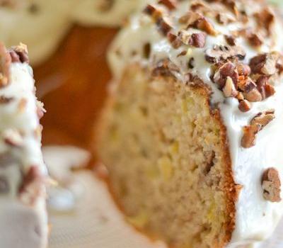 Prepare glaze by beating cream cheese, powdered sugar, vanilla, and 1 Tbsp. milk until well blended. Slowly add remaining 1 Tbsp. milk, beating until smooth. Immediately pour glaze over cooled cake, and sprinkle with remaining ½ cup toasted pecans.