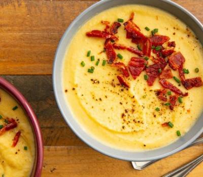 Season with salt and pepper to taste, then ladle into bowls and garnish with chives and bacon before serving.