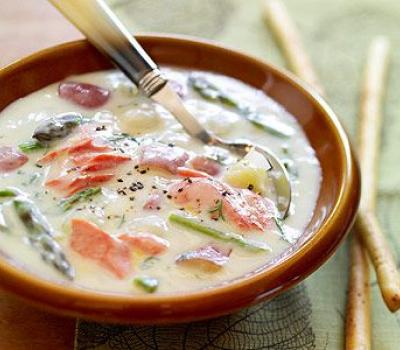 In a large screw-top jar, combine milk and cornstarch. Cover and shake welncel; stir into soup. Stir in asparagus. Cook and stir until slightly thickened and bubbly. Cook and stir for 2 minutes more. Gently stir in poached salmon or canned salmon; heat through. If you like, garnish with fresh dill sprigs and/or cracked pepper.