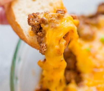 AKA Cheesy Sloppy Joe Dip. I just had to say that right away. The dip is easy, ready in about 15 minutes, tastes like cheesy sloppy Joes, and it’s sure to please any crowd. When broiling the cheese, pay close attention so it doesn’t burn.