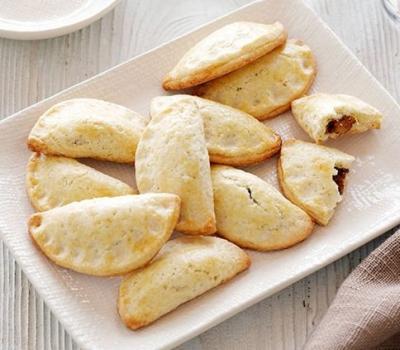 Roll out 1 disk of dough on a floured work surface to 1/8 to 1/4-inch thickness. Using a 2 1/2-inch diameter biscuit cutter, cut out dough rounds. Gather the dough scraps into a disk, then cover and refrigerate while assembling the cookies. Spoon the fruit mixture in the center of each dough round. Lightly moisten the edges of the dough with the egg wash. Fold the dough over the filling and press the edges to seal. Arrange the cookies evenly apart on the prepared baking sheets. Brush the tops of the cookies with egg wash. Bake until the cookies are pale golden, about 18 minutes.