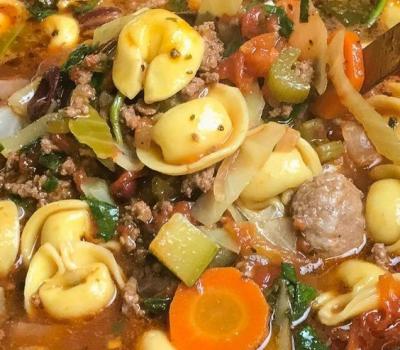 This hearty Tortellini soup is loaded with vegetables, ground beef, sausage and tortellini simmered in a savoury broth.