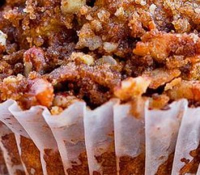 Prepare the topping for the muffins by mixing pecans, brown sugar, cinnamon, flour together. Then add softened butter by cutting it into the dry ingredients with the fork until you have a good crumble topping. Sprinkle this mixture over muffins.