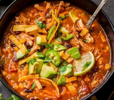 Serve the soup with some tortilla strips, pieces of avocado, fresh cilantro and lime wedges.