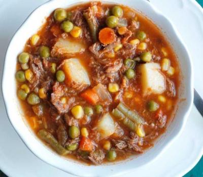 Add beef, potatoes, remaining veggies, remaining beef broth, tomato soup, water, salt and pepper.