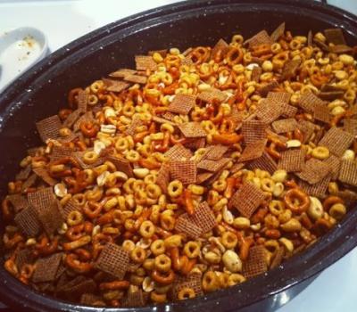 Liquid mix - Melt butter, stir in everything else.In a giant roasting pan - mix in the dry ingredients then pour the liquid mix over top, stirring until completely mixed