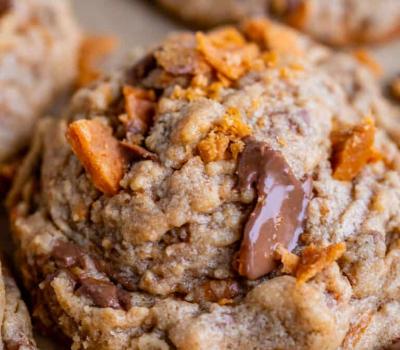 Strange note: I do not love eating these cookies warm. (Besides Sugar cookies, I think this is a first for me!) The butterfinger melts in the oven and I don't love the chewy texture. I prefer to wait until they are approaching room temperature before eating.