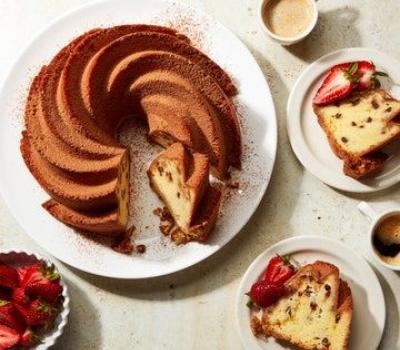 Pour one-third of the batter into the prepared pan. Dollop half of the mascarpone mixture over the top of the batter and sprinkle with half of the mini chocolate chips. Pour half of the remaining batter over the top, repeat with the remaining mascarpone and mini chocolate chips, and cover with the remaining batter. Drag a knife through the batter, making a figure-eight motion, around the whole Bundt one time. Tap the pan twice on the counter to release any air bubbles. Bake the cake until a wooden skewer or toothpick inserted into the center comes out with the slightest bit of crumb, 65 to 80 minutes.