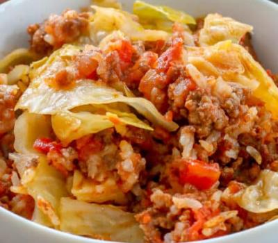 Preheat the oven to 350°F. Spread the cabbage across the bottom of a 9x13 dish (two smaller pans will work as well). In a large skillet, over medium heat, cook the ground beef along with the onion.Drain any grease from the pan and add the rice, chili powder, garlic powder, salt, and pepper to the skillet with the meat. Add the crushed tomatoes and stir to combine. Spread the meat mixture over the cabbage in the baking dish.