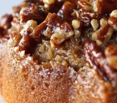 Once 10 minutes have passed, place a large plate over the top of the bundt pan to invert the cake onto the plate. I like to bang the top of the pan a few times before I lift it up to make sure those loose pecans unstick from the pan