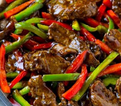 This pepper steak stir fry is thinly sliced flank steak cooked with red and green bell peppers in a savory sauce. A quick and easy meal that tastes even better than take out!