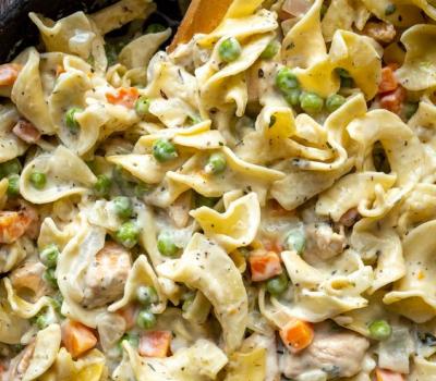Cook noodles al dente, according to package directions.In a large skillet, melt butter over medium-high heat. Stir in onion, garlic, Italian seasoning, peas, and carrots. Season with salt and pepper.