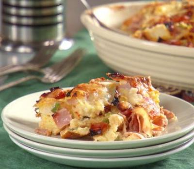 Butter a 2 1/2- to 3-quart baking dish. In a large bowl, whisk together the eggs, milk, mustard, paprika, and salt.Place half of the bread in the bottom of a baking dish. Top with half each of the ham, scallions, and cheese. Repeat with a second layer of the remaining ham, scallions, and cheese, pressing down as necessary to fit in the baking pan.