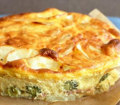 Lifting potatoes out of egg mixture, arrange half the potatoes in pan. Layer with ham, broccoli, cheese, and remaining potatoes. Pour egg mixture over top. Press down firmly so that potatoes are fully submerged in egg mixture.