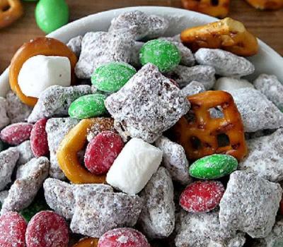 An easy and delicious holiday snack mix made with chocolate Chex cereal, milk chocolate, peanut butter, pretzels, marshmallows and chocolate candies. Try this Christmas muddy buddy recipe today.