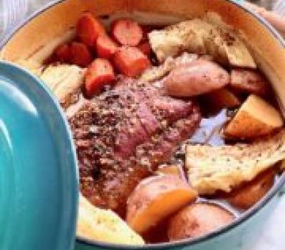Turn the brisket over. Add carrots and potatoes to the pot. Sprinkle with steak seasoning or salt and pepper. Cook 1 hour.