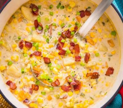 Add sliced potatoes, 4 cups corn kernels, 2 tsp salt, 1/4 tsp black pepper, and 1/4 tsp cayenne pepper. Pour corn stock into the pot, bring to a light boil then simmer uncovered 10-15 minutes or until potatoes are tender. Season with salt and pepper to taste**. Ladle into bowls and garnish with reserved bacon and chopped chives.