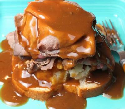 Place bread on plate and cover with mashed potatoes, a little of the gravy, the meat, and the rest of the gravy.Serve hot with a side salad or hot vegetable to make a meal.