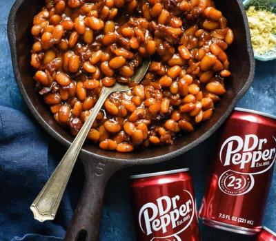 These homemade Dr. Pepper baked beans with bacon start with simple canned beans and turn into a sweet, salty, glazy, delicious side dish. Easy stovetop-to-oven preparation, all in one skillet.