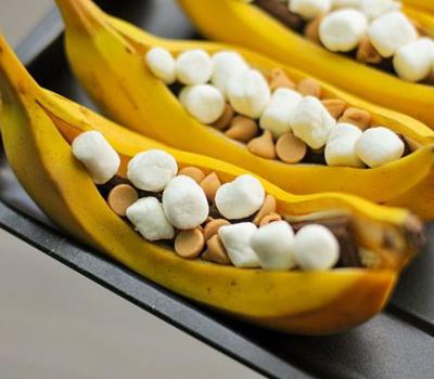 In the peel, slice banana lengthwise, being careful not to slice all the way through the banana. Pry open sliced pocket and stuff with 1/4 of the chocolate chips and peanut butter chips. Top with 1/4 of the marshmallows. Repeat with remaining 3 bananas.Light one chimney 2/3 full of charcoal. When all the charcoal is lit and covered with gray ash, pour out and arrange the coals on one side of the charcoal grate. Set cooking grate in place, cover grill and allow to preheat for 5 minutes. Clean and oil the grilling grate. Place bananas on cool side of grill, cover, and cook until bananas have completely softened and peels have blackened, about 10 to 15 minutes. Remove from grill, let cool for 5 minutes, then eat with a spoon.