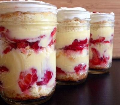 Slice each cake circle in half horizontally. Place the bottom half in the bottom of a half-pint jar. Top with a spoonful of the sliced strawberries (including some juices), then a spoonful of the custard. Tap the jar a few times to make sure everything is settled. Top with a layer of the cake crumbs, then another layer of the strawberries and custard. Place the top half of the cake circle on top of the second layer of custard. Top it all off with a dollop of the whipped cream.