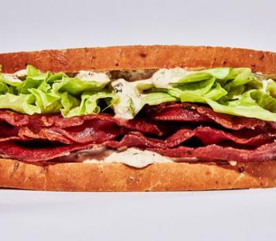To build sandwiches, spread mustard mixture evenly over each slice of bread. Divide bologna between 2 slices and top with lettuce; drizzle with pickle brine. Close up sandwiches and cut in half