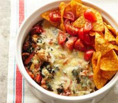 Bake, covered, for 30 to 35 minutes or until heated through. Sprinkle with the remaining cheese. Let stand for 5 minutes before serving. If desired, garnish with cherry tomatoes, chopped avocado, and/or corn chips.
