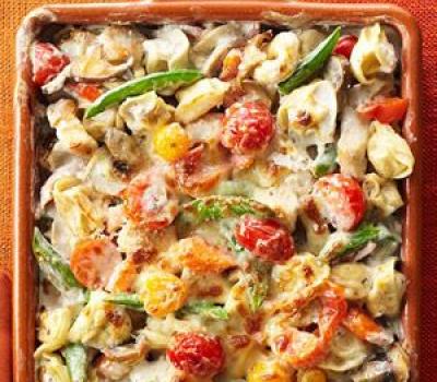 Cook tortellini in boiling salted water according to package directions, adding the carrot during the last 5 minutes of cooking and the sugar snap peas during the last 1 minute of cooking; drain.Meanwhile, heat margarine or butter in a 12-inch skillet. Add chicken and mushrooms, and cook about 5 minutes or until chicken is no longer pink. Remove from skillet.