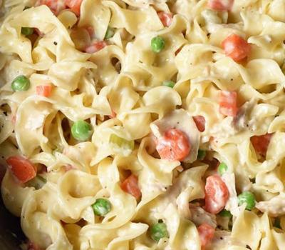 Cook noodles al dente, according to package directions.In a large skillet, melt the butter over medium-high heat. Stir in the onion, garlic, and peas and carrots; season with the salt and pepper. Cook for about 3 minutes until onions are soft and translucent. Stir in the flour until combined.