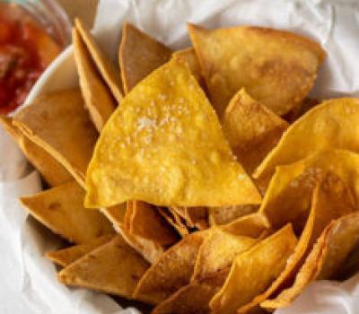 Cook at 350 for 3 minutes, open the basket, flip the chips, spray with cooking spray & add more salt (if desired), and cook for another 2-3 minutes or until browned and crisp.