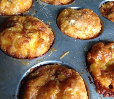 Layer ingredients in muffin tins: Starting with 1 pinch of cheese mixture, followed by a couple of pinches of the fillings (evenly distribute between the muffins, add 1 more small pinch of cheese, and last, top with egg mixture.