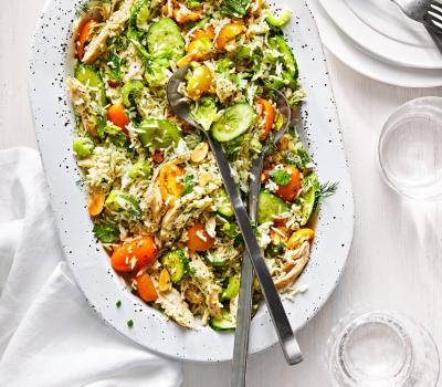 Incorporating two mainstays of the Southern diet—chicken and rice—this salad is an example of the kind of delicious home cooking that grew out of the necessity of using every bit of food. This recipe keeps things light and savory, pairing basmati rice with vegetables and rotisserie chicken. Herbs and a bright lemon dressing give it vivid colors and a fresh taste. By starting with two smart shortcuts—microwavable rice and rotisserie chicken—you'll have a meal that takes no time at all, but is sure to impress.