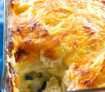 Place a half of the sliced potatoes in the baking dish. Pour half of cheese sauce over potatoes. Repeat with second layer of potatoes and cheese sauce.