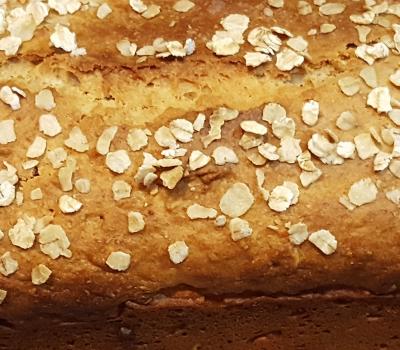 Preheat oven to 375 F. Generously coat a 9x5 inch loaf pan with cooking spray. Sprinkle 1 tablespoon oats in the pan, coating the sides and bottom with the oats. Stir together flours, baking powder, baking soda and salt in a large bowl. In a separate bowl, combine 1 cup oats, yogurt, egg, oil, and honey, stirring with a fork until well blended. Stir in milk. Gently stir the yogurt mixture into the flour mixture until thoroughly blended, but avoid overmixing. Scrape the batter into the prepared pan, spreading evenly to the edges. Sprinkle the remaining 1 tablespoon of oats over the top of the loaf. Bake for 40 to 50 minutes or until a toothpick inserted in the center comes out clean. It is normal for the top to crack. Remove from oven and let cool on a wire rack for 15 minutes. Run a knife around the edges of the pan and turn the loaf out onto the wire rack. Let cool for 45 minutes or until barely warm. Make 12 servings.